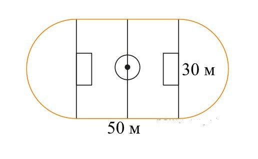 Решаем школьные задачи - длина беговой дорожки Возле школы построен стадион с игровым полем (см. рис.). Вокруг стадиона проложена беговая дорожка. Найдите ее длину. Число принять равным 3,14.