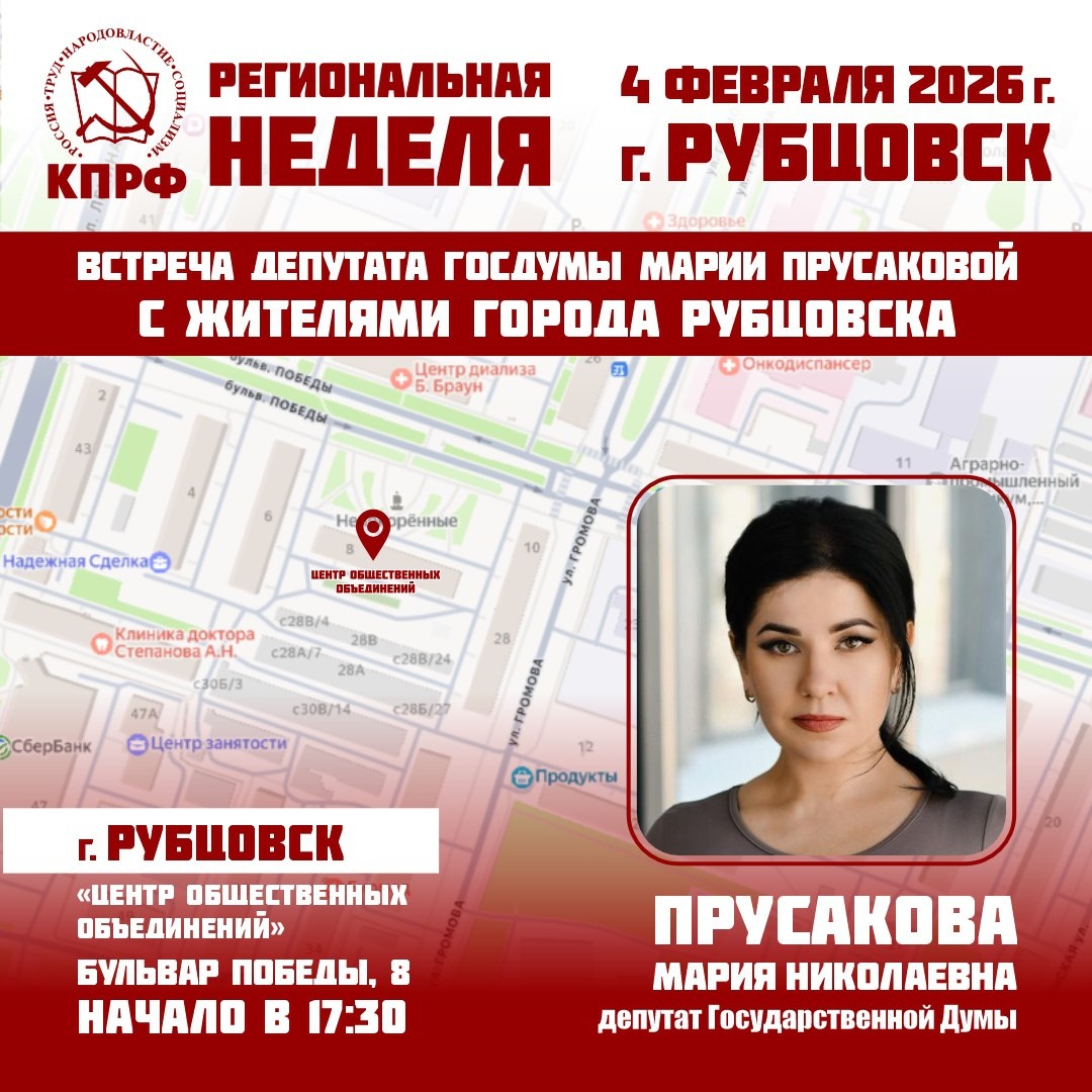 Встреча депутата Госдумы от фракции КПРФ Марии Прусаковой с жителями г. Рубцовска. 🔔Встреча состоится 4 февраля 2026 года в 17:30 📍Место проведения встречи: Алтайский край, г. Рубцовск, бульвар Победы, 8, "Центр общественных объединений"
