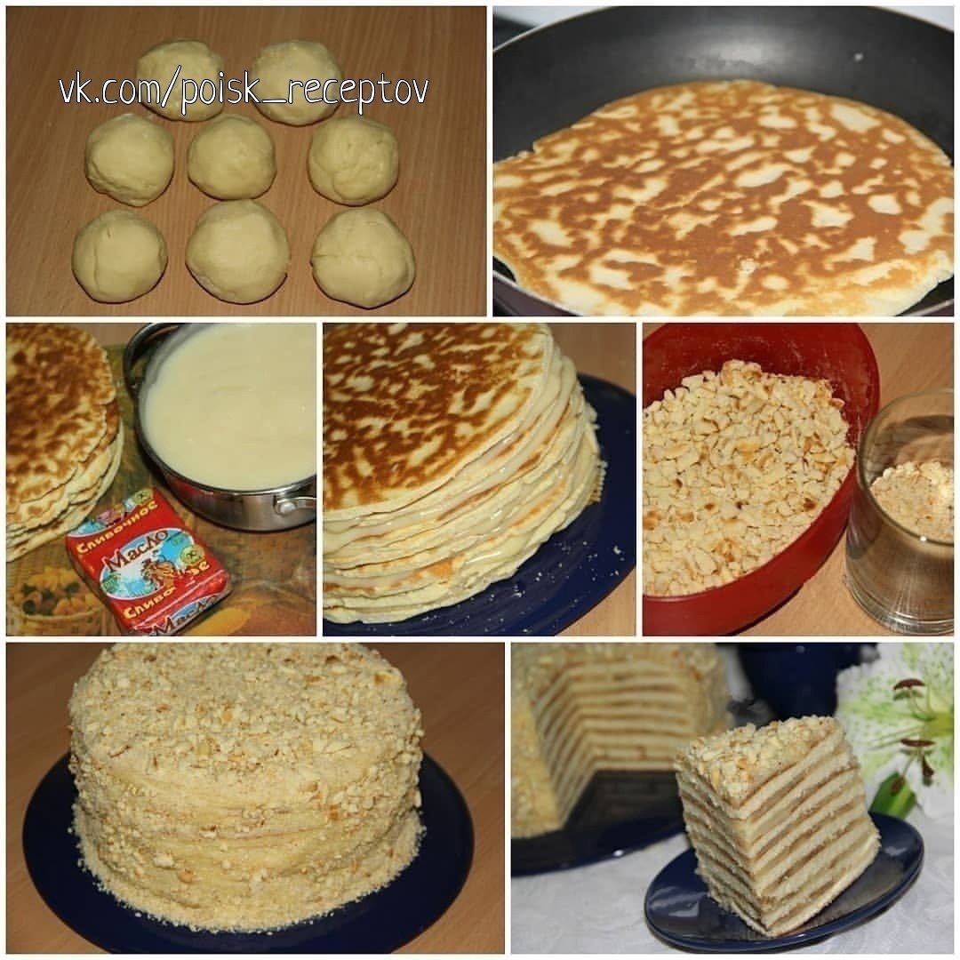 Поставить торт в холодильник на ночь. Утром насладиться кусочком нежного, вкусного торта на сгущенке, приготовленного на сковороде.