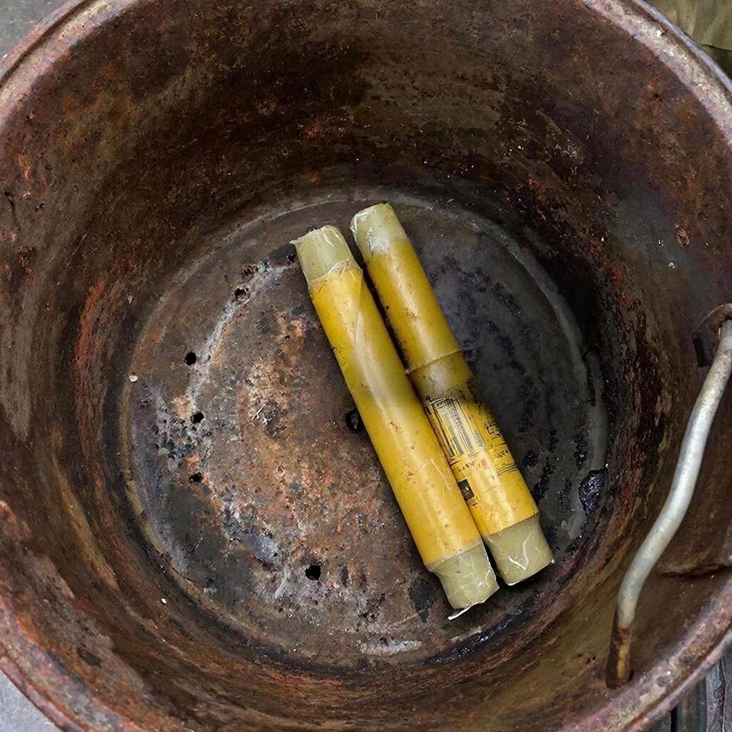 Вот и весь комплект. Не газовая горелка. Дырявый, прогоревший на кострах котелок и пара десятков простых свечей, купленных в хозяйственном магазине «для праздников и похорон».