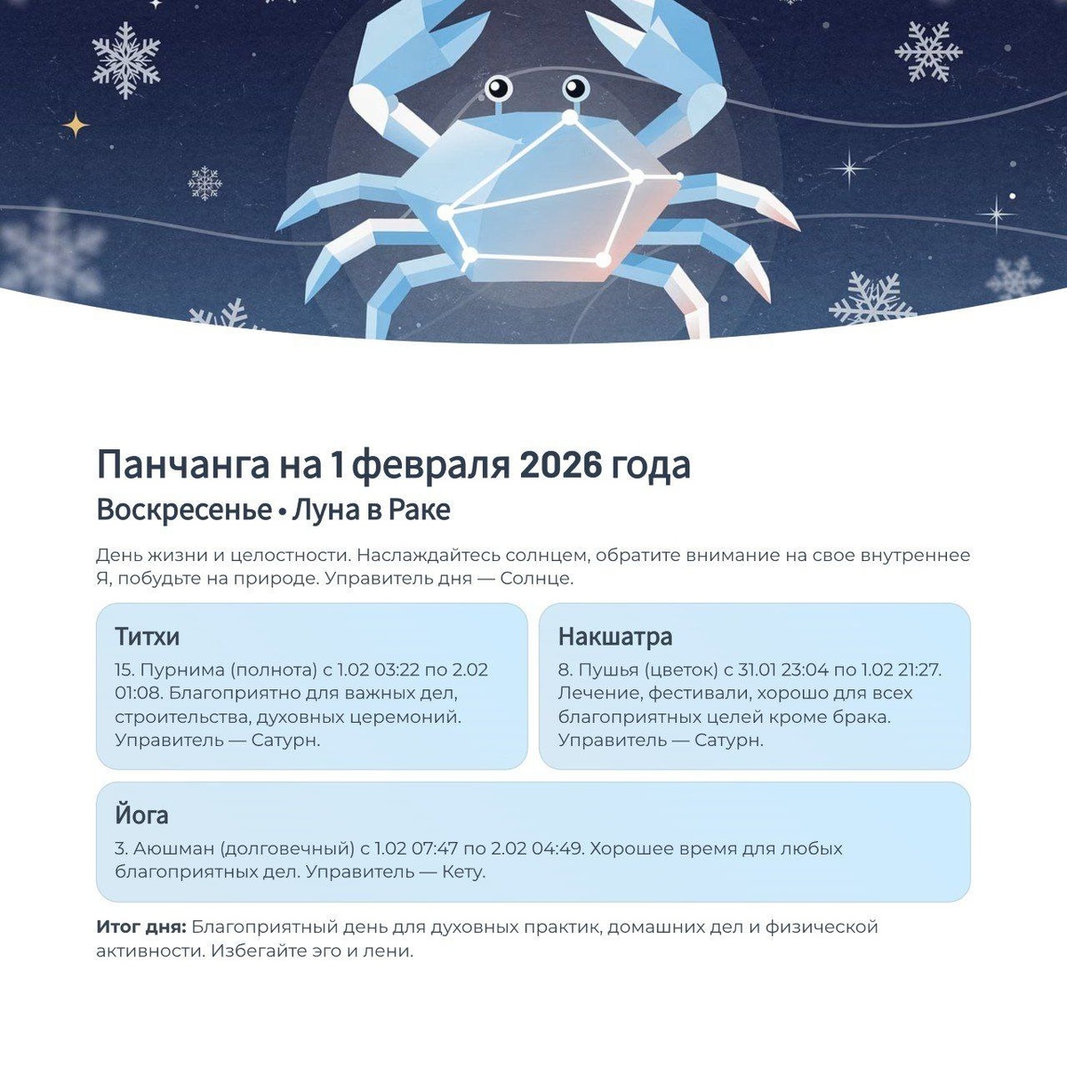Сегодня - день, когда можно пригласить процветание в дом. Но ключ - в вовремя нажатой кнопке «старт». Воскресенье. День Солнца. Энергия - ясная, сильная, созидательная. Сегодня можно заложить основу, которая будет работать месяцами. ЧТО СЕГОДНЯ ОСОБЕННОГО 1. Магха-Пурнима - священное Полнолуние. Пик энергии. Идеально для благодарности, завершения циклов и щедрых жестов. Даже малое пожертвование сегодня умножается в силе. 2. Рождение Богини Лалиты (Шодаши Джаянти). День высшей гармонии, красоты и мудрости. Всё, что связано с домом, семьёй, искусством и утончённостью, - под её покровительством. 3. Луна в накшатре Пушья (до 21:28). Одна из самых благословенных накшатр. Всё, что направлено на укрепление, заботу и рост, получает зелёный свет. ГЛАВНОЕ ПРАВИЛО ДНЯ: ЖДЁМ ДО 14:13 До 14:13 - время Вишти караны. ❌ Не начинаем ничего нового. ✅Чистим, планируем, медитируем, завершаем вчерашнее. После 14:13 - включается «режим изобилия». Начинается благоприятная Бава карана и Айюшман йог