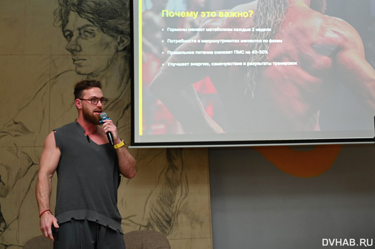 Накануне в хабаровском торговом центре Brosko Mall прошла «Келди туса» - мероприятие для любителей правильного питания и спорта. В рамках события в коворкинге «Коммуна» прошли лекции от экспертов. Одну из них провел владелец клуба «Заряд» - фитнес-тренер Семен Липин, который рассказал девушкам о теме питания по циклу. Специалист объяснил, какие продукты, в какую фазу необходимо есть, а также, какие тренировки в это время должны преобладать. Кроме того он рассказал о том, для чего необходимо набирать свою индивидуально рассчитанную норму белка, углеводов и жиров. - Жиры набрать очень просто, в течение дня они набираются по щелчку пальцев. Норма составляет 0,8 – 1,2 грамма на килограмм веса. Жиры по сути усваиваются в жир, то есть при легком профиците мы начинаем толстеть. Норма углеводов составляет 2-4 грамма на килограмм веса. В первую очередь у себя на ведении я своих подопечных обычно отправляю к эндокринологу, посмотреть дефициты. Потому что, например, если низкое железо, жиросжиган