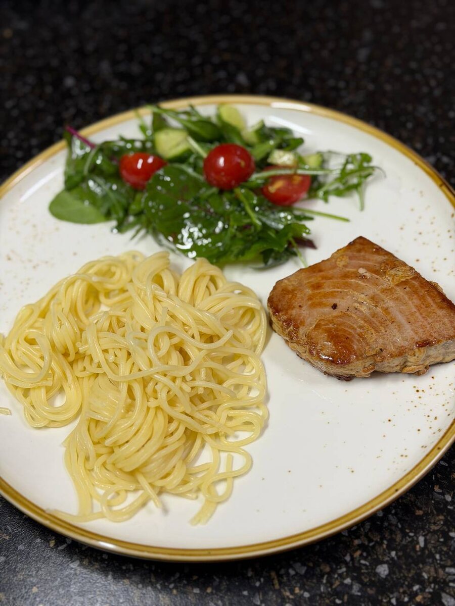 Перед нами классический сбалансированный обед: нежный стейк из рыбы, паста и свежий салат из зелени с томатами черри.