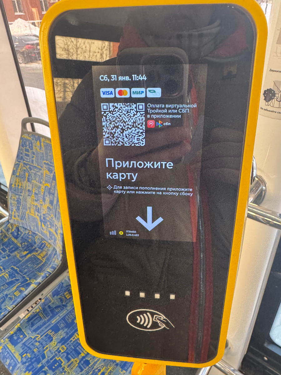 Для оплаты проезда (регистрации поездки) при входе в транспорт необходимо приложить к валидатору (считывающее устройство, расположенное в салоне около двери), а точнее к его мишени, проездной билет, банковскую карту или иное электронное устройство с технологией бесконтактной оплаты и удерживать в этом положении не менее двух секунд. Оплата проезда подтверждается зеленой индикацией и/или соответствующим сообщением на валидаторе.