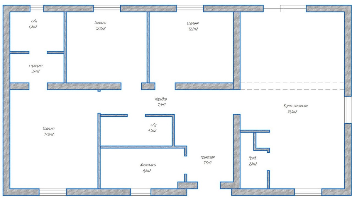 Сразу оговорюсь - это не интерьер как таковой. До профессионального интерьера даже эскизной стадии этим картинкам далеко. Работа позиционировалась как картинка для соц.сетей у человека, занимающегося строительством частных домов. Итак в качестве основы у нас вот такой план. Сначала все переводим. Прости, великий и могучий 1 этап. Грузим в ламарену и делаем картинку-основу. Экспериментально доказано что сразу все "поднять" вместе с мебелью не получается. Промт примерно такой. Use light beige parquet flooring in all living spaces (bedrooms, living room, kitchen, children's room, study) Use beige ceramic tiles in the boiler room, entrance hall/cloakroom, and bathroom Important: This is a first stage render - NO FURNITURE should be added. Show only the architectural elements: walls, doors, windows, and floor finishes. Use the plan strictly as the base: Keep the EXACT layout, proportions and thickness of all walls Maintain precise room shapes and sizes as shown in the 2D drawing Do NOT cha