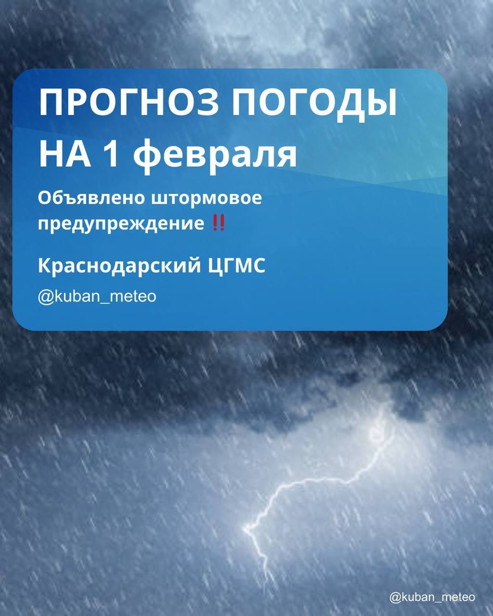 ☁️⛅⛈️ 🌧 Воскресенье, 1 февраля 📍 Краснодарский край Облачно с прояснениями. 🌧 Временами осадки в виде дождя, мокрого снега. ⚠️ В отдельных районах: — сильный дождь, ливень в сочетании с грозой; — усиление ветра с порывами 20–25 м/с (КМЯ); — местами в северной половине края гололёд; — на дорогах гололедица. 💨 Ветер западной четверти 5–10 м/с, в горах местами порывы 15–17 м/с. 🌡 Температура воздуха: ночью 0…+5°, местами в северной половине края и на Азовском побережье –1…–6°; днём 2…7°, местами в северной половине края и на Азовском побережье 0…–5°; 🏔 в горах ночью и днём –1…–6°; 🌊 на Черноморском побережье ночью 1…6°, днём 4…9°. 📍 По г. Краснодару Облачно с прояснениями. 🌧 Ночью небольшой дождь, днём дождь с мокрым снегом. 💨 Ветер западный 4–9 м/с. 🌡 Температура воздуха ночью 1…3°, днём 2…4°. С заботой, Краснодарский ЦГМС @kuban_meteo 💙