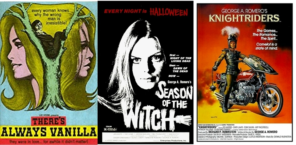 Это фильмы «Как мухи на мёд» («There’s Always Vanilla») 1971 года, «Время ведьм», он же «Голодные жёны», («Season of the Witch») 1972 года и «Рыцари на колёсах» (Knightriders), который вышел аж 9 лет спустя. Романтическая комедия, психологическая драма и приключенческий фильм — кажется, как их вообще можно объединять в трилогию?