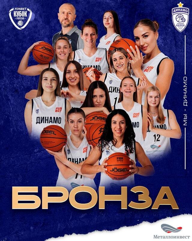 В Сыктывкаре завершился Финал четырех женского Кубка России по баскетболу. 31 января «Динамо» (Курск) победило МБА-МГУСиТ из Москвы во встрече за третье место со счетом 74:63 (18:24, 16:11, 24:20, 16:8). Наши девушки завоевали бронзовые медали. После обидного поражения от хозяек — «Ники-Лузалес» в полуфинале динамовкам нужно было настроиться на бронзовый матч. Первая четверть обозначила перевес москвичек, горевших желанием взять реванш у Курска за недавнее поражение в чемпионате. Они повели «плюс 6» — 18:24. Это отставание в баскетбольных «качелях» команда Сергея Вознюка практически ликвидировала во втором периоде. На «экваторе» счет был 34:35 в пользу МБА. После большого перерыва курянки заиграли лучше соперниц. К исходу получаса они опережали столичный клуб на три очка — 68:65, а в четвертой четверти, имея двукратный отрыв, оформили победу с преимуществом в 11 баллов. Ударное трио Курска составили Вероника Сазонова — 17 очков, Нина Глонти — 16+16 подборов и Дарья Репникова — 9 очков.