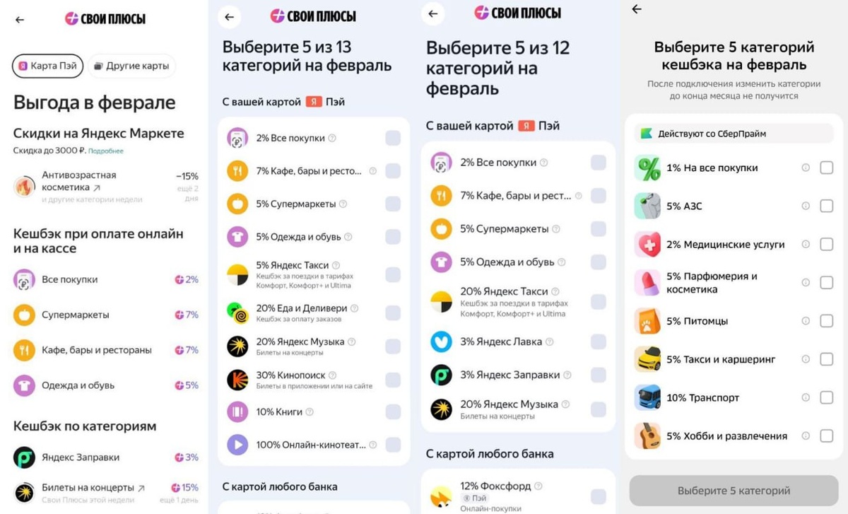 💸#Яндекс Вернул выбор категорий на февраль. У меня остались те, что я выбрал ранее (скрин слева). Пост о карте. В комментариях подтверждают - приветственные 5% на всё суммируются с кэшбэком в выбранных категориях и в барабане. 💳#Сбер Можно выбирать категории на февраль. 💳#КЕБ Похоже, доп категории по дебетовке Card Plus не будет и в феврале - в Документе пусто. 💳#ДомРФ Можно зафиксировать по 31.03.26 ставку по НС: 15,1% - всем, 15,2% - ЗП/премиум на любой ежедневный остаток. Клиентом можно стать онлайн. Топ ставки.
