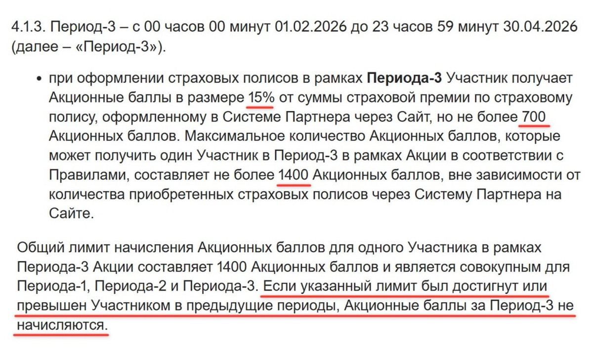 Яндекс изменил Правилла акции по ОСАГО - с 01.02 по 30.04.26 можно получить кэшбэк 15% (на сайте не исправлено - 30%), макс 700б за 1 полис, 1400 за весь период. ❗️Общий лимит 1400б для одного участника теперь является совокупным для всех периодов с 28.08.25 по 30.04.26. • Обещаны цены как на сайтах 10+ страховых компаний, без доплат. • Нельзя участвовать без подписки Яндекс Плюс (60 дней до 4 чел). • Баллы начисляются по Яндекс ID с которым пользователь авторизовался в акции, даже если при оформлении полиса указан телефон или почта, к которым привязан иной Яндекс ID. • Начисление в течение 10 рабочих дней с даты начала действия полиса. Клиенты пишут, что при оплате картой Яндекса (оплатить можно любой картой - МСС 6300), дополнительно будет кэшбэк по категории "за все". Пост о Карте Пэй (+5% на всё) Закреп / Чат / Акции банков