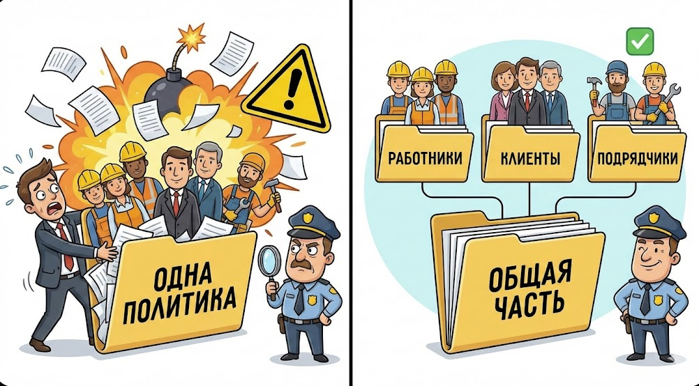 Недавно разбирали с заказчиком вопрос, который показалось важным разобрать в подробной статье, так как в рамках телеграмм-канала формат подробности не допускает: «Можно ли написать одну политику обработки персональных данных, которая закроет сразу всех - и сотрудников, и клиентов, и контрагентов?» Звучит привлекательно: один документ вместо трёх, меньше бумаги, меньше согласований. Но когда начинаешь копать в требования 152-ФЗ, выясняется, что такая «экономия» может обойтись очень дорого. Давайте разберем риски и, что можно все таки сделать.
