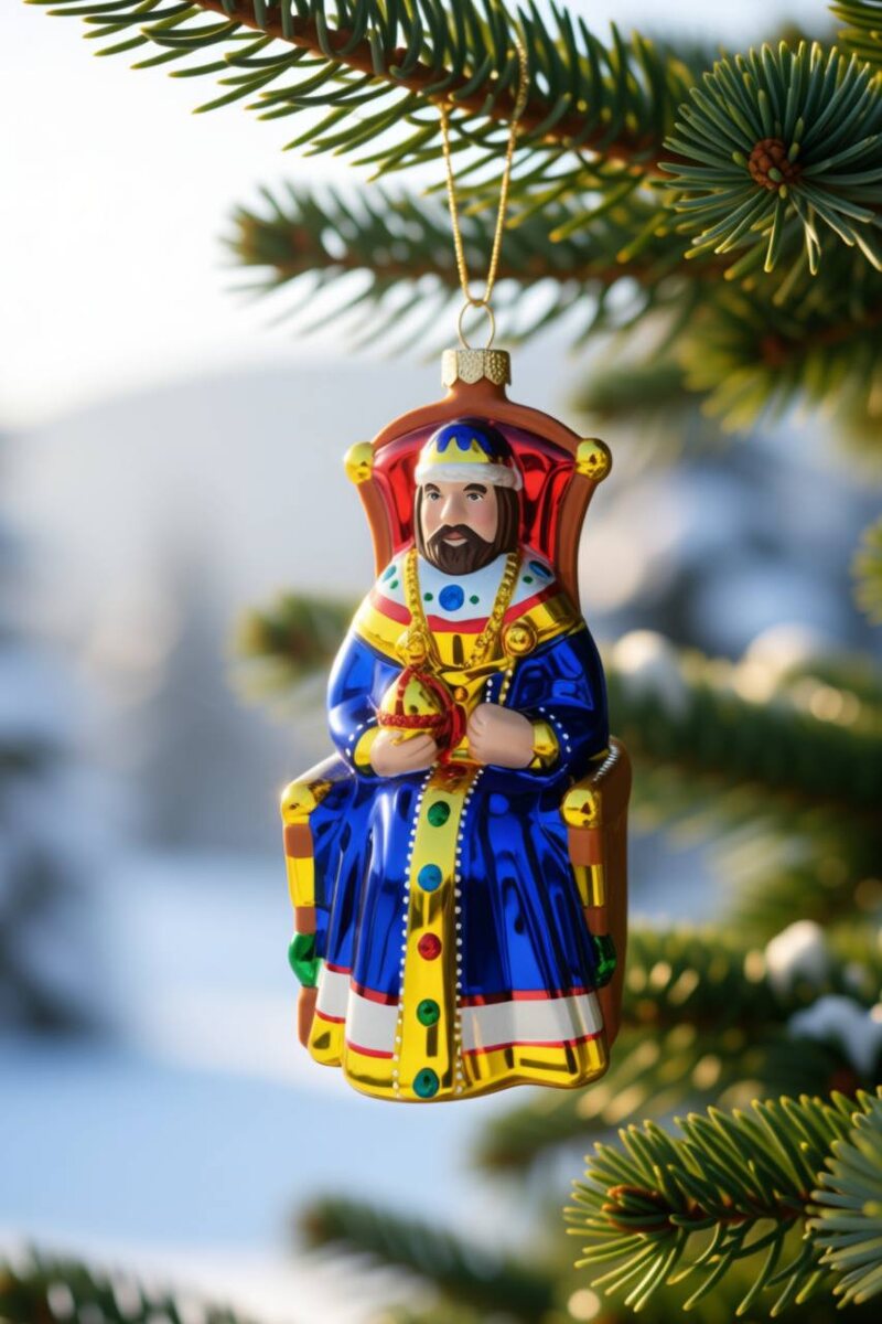 ❄️ Ещё не рассвело по-настоящему. Снег лежит тихо, безмолвно, будто прислушивается к миру. Воздух прозрачен и звенит — тот самый, зимний, русский, от которого щемит в груди и хочется идти медленно, не нарушая покоя. Именно в такое утро хочется напомнить о Царе Салтане на троне — игрушке, будто созданной для тишины, для неспешного взгляда и внутреннего тепла. Сам царь облачён в синее царское одеяние — густого, почти кобальтового, благородного оттенка. Этот цвет не спорит с золотом, а мягко его дополняет. Он переливается едва заметно, словно ткань старого кафтана, прогретого памятью рук и временем, хранящего следы долгой истории. 🎠 Трон читается как благородный бархат — плотный, глубокий, насыщенный. Его красные и винные оттенки напоминают старинные палаты: зима всегда за окном, а внутри — тепло, тишина и неспешный разговор. Стекло здесь вдруг перестаёт быть стеклом и становится тканью, памятью, временем. 🐈 Кот у подножия — тихий сказочный страж. Он сидит спокойно, будто знает все