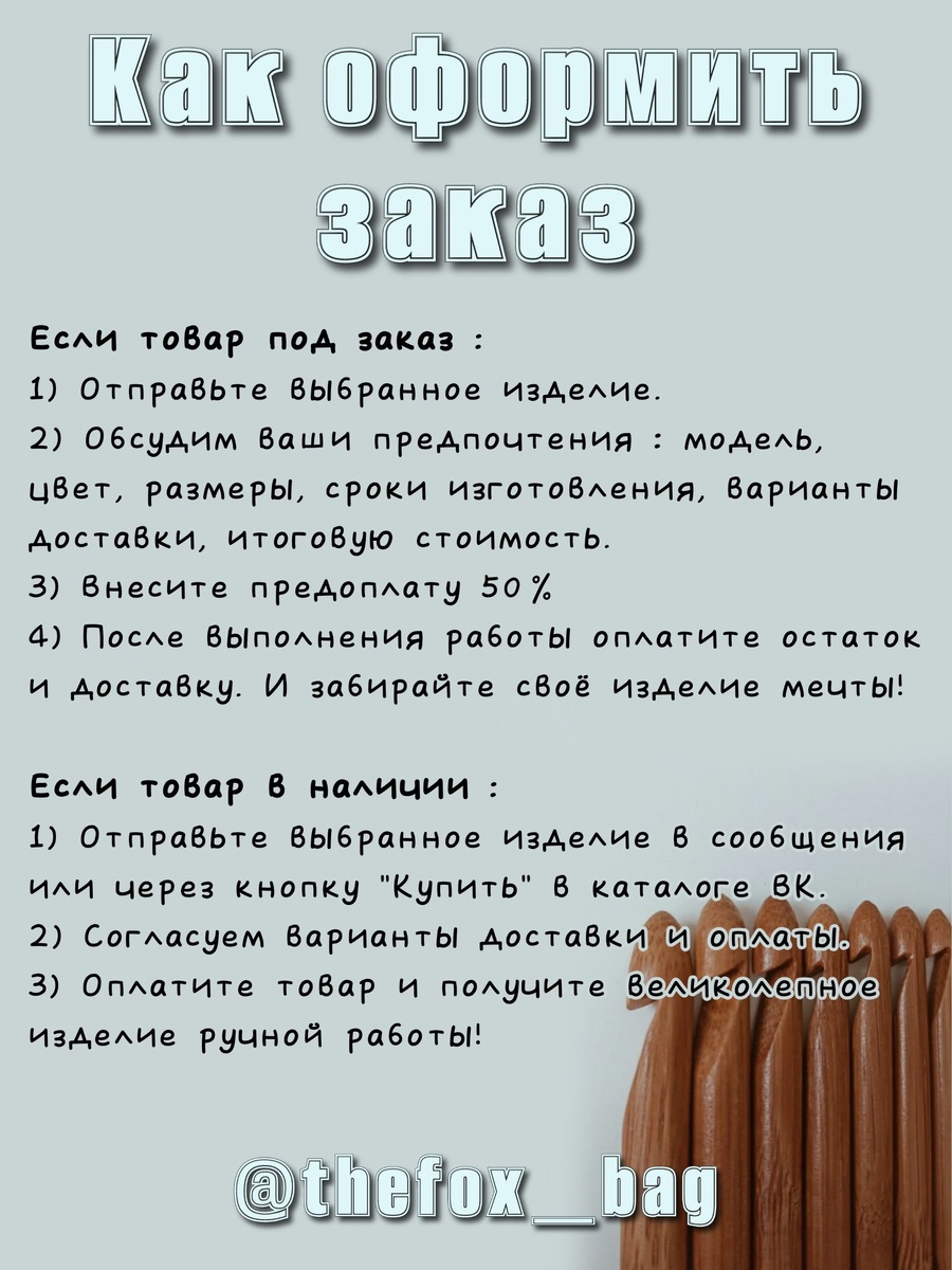 ! 🤍 Выбор идеала - Ознакомьтесь с каталогом и забирайте то, что есть в наличии или же создайте свой собственный стиль, выбрав цвет, модель и размер. 🤍 Оформление заказа – проще простого! Выбрали? Далее – обсудим сроки изготовления, удобный способ доставки и оплаты. 🤍 Подтверждение и ожидание чуда! После оформления заказа, внесите предоплату на закупку материала (50%). Остальное - перед отправкой. И спокойно ждите, пока я буду колдовать, воплощая ваши желания. 🤍Срок изготовления зависит от сложности изделия и вашего положения в очереди заказов. Обычно 5-10 дней. Иногда В разгар сезона, срок может достигать до 4-х недель. Всё обсуждается индивидуально! 🤍 🔤оставка Как только ваше вязаное чудо будет готово, я отправлю его вам удобным способом: СДЭК, ПОЧТА, ЯНДЕКС, BOXBERRY и др. Стоимость и сроки доставки рассматриваются индивидуально, в зависимости от вашего местоположения и транспортной компании. К примеру, сумочка уехала в Москву за 512₽ Станьте частью ценителей ручной ра