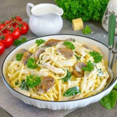 · Вариации: Вместо курицы подойдет ветчина или индейка. В сливки можно добавить 1-2 плавленых сырка (без добавок) для более тягучего соуса.