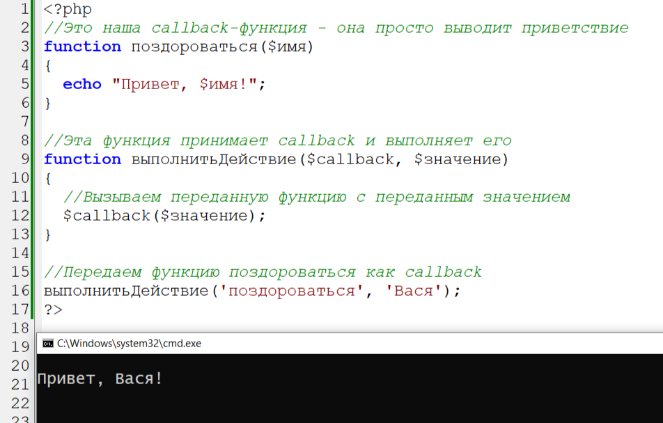 Представьте, что вы даете другу инструкцию: "Когда придет посылка, позвони мне". В программировании callback-функция — это такая же "инструкция", которую вы передаете другой функции или методу со словами: "Когда произойдет определенное событие, выполни этот код". Callback (обратный вызов) — это функция, которая передается как аргумент в другую функцию и выполняется позже, когда произойдет какое-то событие или условие. Допустим, у вас есть функция ОбработатьЗаказ(), которая: Вы можете передать в функцию разные способы уведомления (выдачи сообщения заказчику): SMS, электронная почта или звонок — и функция ОбработатьЗаказ() вызовет указанный способ, когда нужно. Далее рассмотрим несколько примеров на РНР. В PHP 5.3+ появились анонимные функции (лямбда-функции) — они позволяют создавать callback прямо на месте: Хотя callback-функции мощны, их чрезмерное использование может сделать код сложным для понимания. Если вы видите много вложенных callback-функций (так называемый "callback hell")