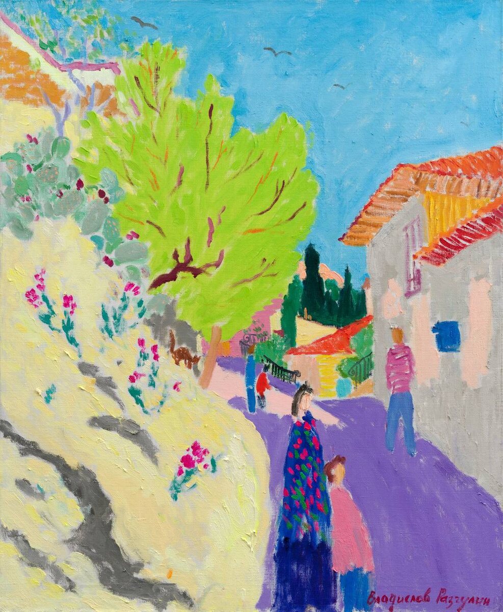 73х60 холст/масло 2024 ••• В работе «Горка» пространство развивается вверх и вперед. Дорога ведет взгляд, фигуры усиливают движение, а яркие сочетания зеленого, фиолетового и теплых оттенков стен создают впечатление живой прогулки. Картина напоминает о радости исследования незнакомого города, где каждый подъем открывает новый фрагмент пространства и новую перспективу. ••• Прогуляться по солнечным улочкам Гурзуфа и окунуться в яркие краски лета можно в галерее YOLKA art до 10 февраля 2026. ••• Москва. Ходынский бульвар 20а, с 11:00 до 21:00 ежедневно. Выставка бесплатная, работы продаются. Вся контактная информация на сайте YOLKA.art
