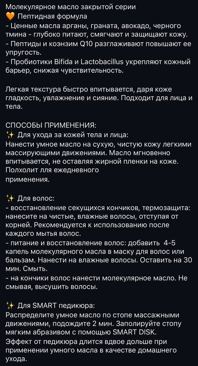 Пептидное молекулярное масло SMART - это домашний уход нового поколения. Это не просто масло, это концентрат молодости и красоты, созданный для тех, кто выбирает лучшее. Почему пептидное масло Smart особенное? ➡️ До 90% активов вместо воды, только действующие ингредиенты. ➡️ Эффект «3D»: - восстанавливает барьер и делает кожу мягкой, - активирует выработку коллагена и эластина, - укрепляет микробиом и поддерживает здоровый pH. ➡️ Липосомальные пептиды проникают глубоко и запускают процессы обновления, сравнимые с салонными процедурами. Для чего оно нужно? ✅ Лицо - уменьшает сухость, разглаживает текстуру, возвращает сияние. ✅ Тело - подтягивает и питает, делает кожу бархатистой. ✅ Руки и стопы - снимает усталость, предотвращает трещины. ✅ Загар - защищает от фотоповреждений, делает загар ровным и красивым. 💎 Каждый ингредиент подобран как драгоценный камень. Мгновенно впитывается, оставляя кожу матово-сияющей без липкости. Идеально даже в жарком климате. По вопросам цены и