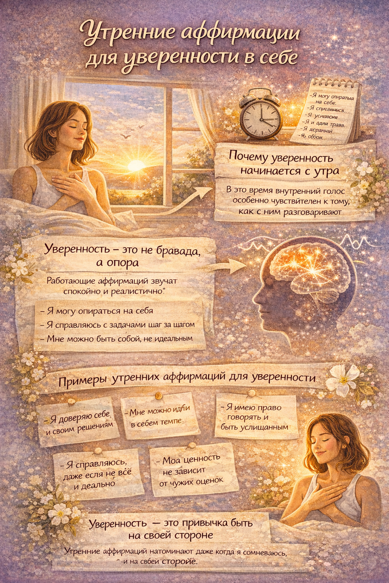 Уверенность в себе редко появляется «вдруг». Чаще всего она формируется из мелких, почти незаметных внутренних жестов поддержки. И утренние аффирмации — один из самых мягких и эффективных способов начать этот процесс, не ломая себя и не играя в чужую роль.