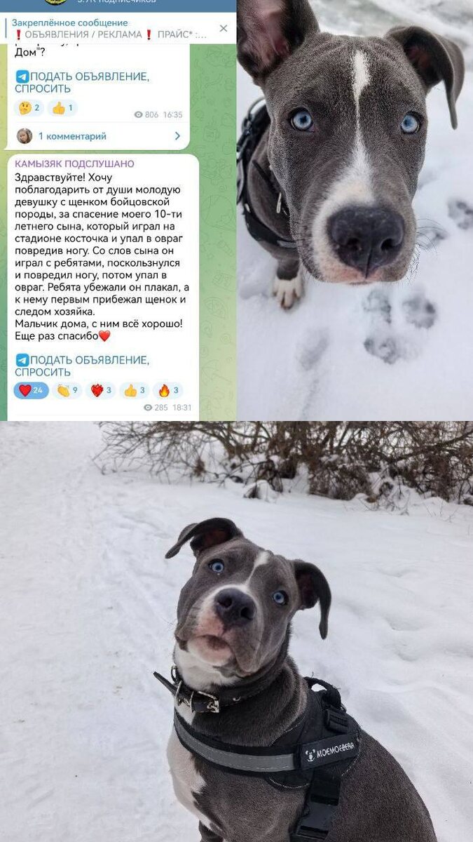 В Камызяке четырехмесячный стаффорд по кличке Майкл во время прогулки услышал плач и стал тянуть хозяина в сторону оврага. Там оказался мальчик, который упал и повредил ногу, а его друзья убежали от страха. Пёс привёл взрослых к ребенку. Мальчика вытащили и проводили домой, он отделался ушибами.