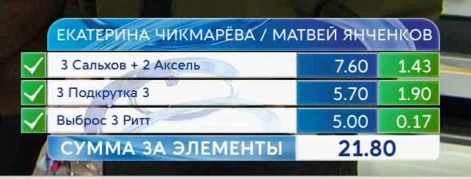 Добрый день, дорогие читатели! Второй турнирный день чемпионата России по прыжкам. Медали разыграют одиночники и спортивные пары. С выступления спортивных пар начинается продолжение чемпионата России по прыжкам. Подкрут, каскад или комбинацию и выброс ждем от каждой пары в отличном исполнении. Екатерина Чикмарева и Матвей Янченков открывают выступления пар. Саша Бойкова и Дмитрий Козловский ни разу не становились победителями чемпионата по прыжкам, а сегодня у тренера пары, Станислава Морозова , день рождения. Вот бы сделать ему приятный сюрприз! Жаль, Саша получает q на акселе. Юлия Артемьева и Алексей Брюханов 3S (партнер упал), тройная подкрутка третьего уровня, 3F выброс. 15,35 балла