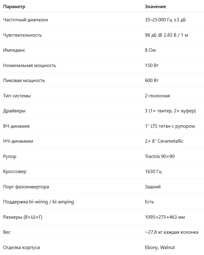 Чувствительность на уровне 94,5 дБ делает эту модель подходящей даже для усилителей с небольшой выходной мощностью. Номинальный импеданс составляет 8 Ом, а заявленная допустимая мощность — до 100 Вт в непрерывном режиме и до 400 Вт в пиковых нагрузках.