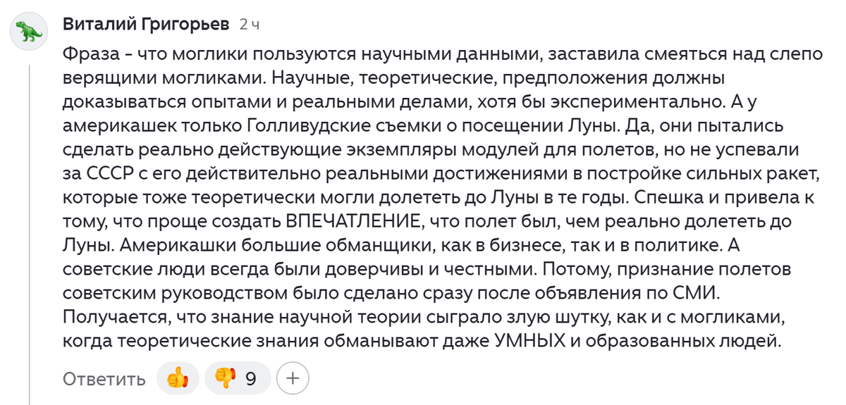 отменяются эмоциями и ярлыками. Давайте отделим физику от обиды. Комментатор так трогательно требует «опытов и реальных дел», что прямо хочется аплодировать… особенно в момент, когда дальше у нег начинается: «у них только Голливуд». То есть эксперименты нужны, но как только эксперимент есть — он у комментатора автоматически становится «съёмкой». Удобная научная методология: всё, что не нравится, объявляем декорацией. Про «СССР теоретически мог долететь» тоже шикарно: у комментатора «теория должна доказываться делами», но тут внезапно “теоретически мог” уже считается аргументом. А «дела» — это, видимо, только те, которые поддерживают его версию. И да, насчёт «только кино», радиосигналы и доплер по траектории принимали не только США (и СССР тоже имел средства наблюдения),лазерная лок