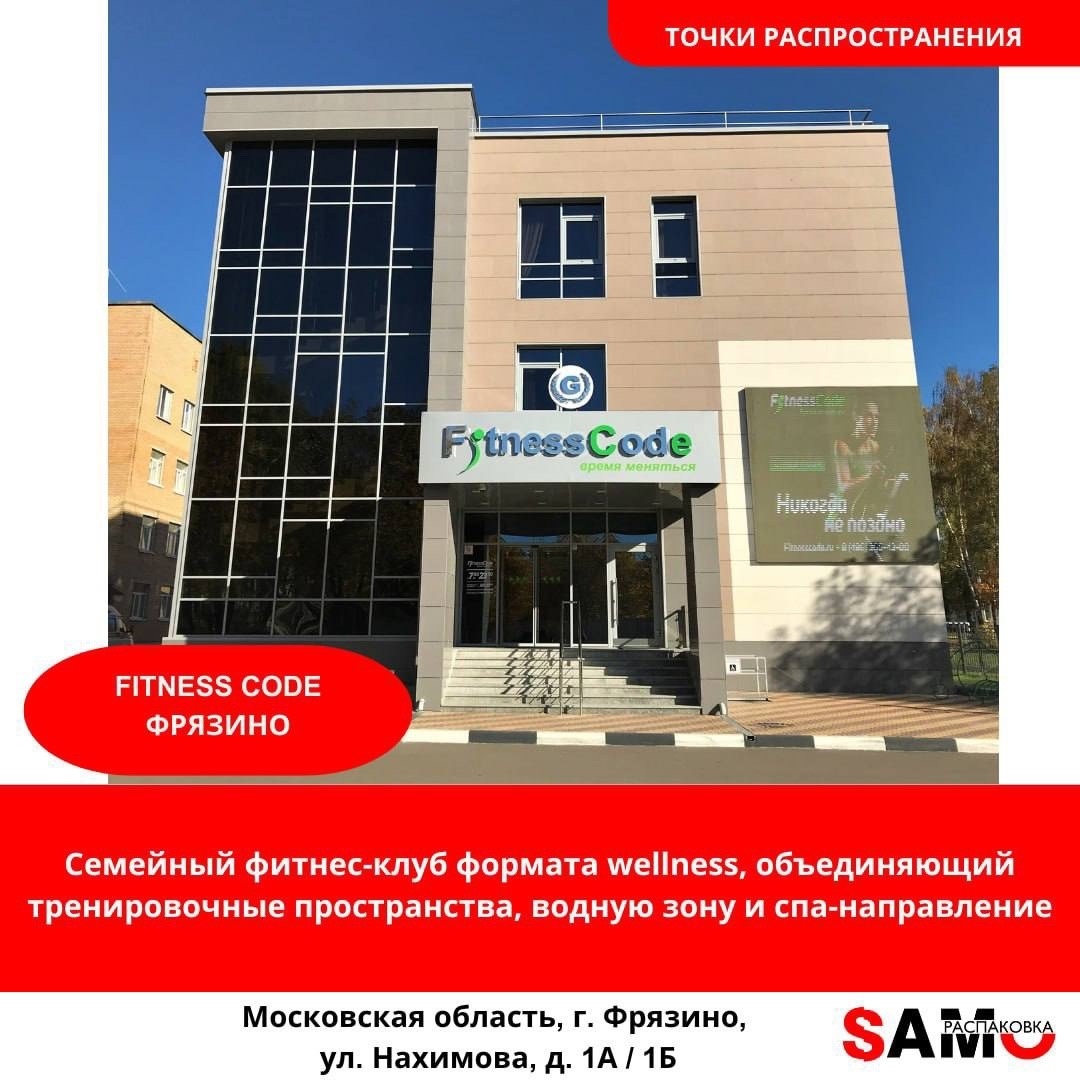#точки_распространения_СамоРаспаковка_Фрязино Fitness Code – точка распространения глянцевого журнала «SAMОРАСПАКОВКА» в городе Фрязино. Семейный фитнес-клуб формата wellness, объединяющий тренировочные пространства, водную зону и спа-направление. Пространство выстроено как многофункциональная среда для занятий спортом, отдыха и восстановления, где соседствуют индивидуальные и групповые форматы тренировок. Клуб занимает отдельное здание и включает тренажерные залы, аквазону с бассейном, залы групповых программ, функциональные и бойцовские студии, а также спа-пространство с банным комплексом. В работе используются современные тренировочные системы и подходы, ориентированные на разные возрастные категории, включая детские программы. Fitness Code работает как место регулярных занятий, семейного досуга и комплексного подхода к физической активности и здоровому образу жизни. Адрес: 📍 Московская область, г. Фрязино, ул. Нахимова, д. 1А / 1Б Контакты: 📞 +7 (499) 110-05-00 📞 +7 (906) 725-43