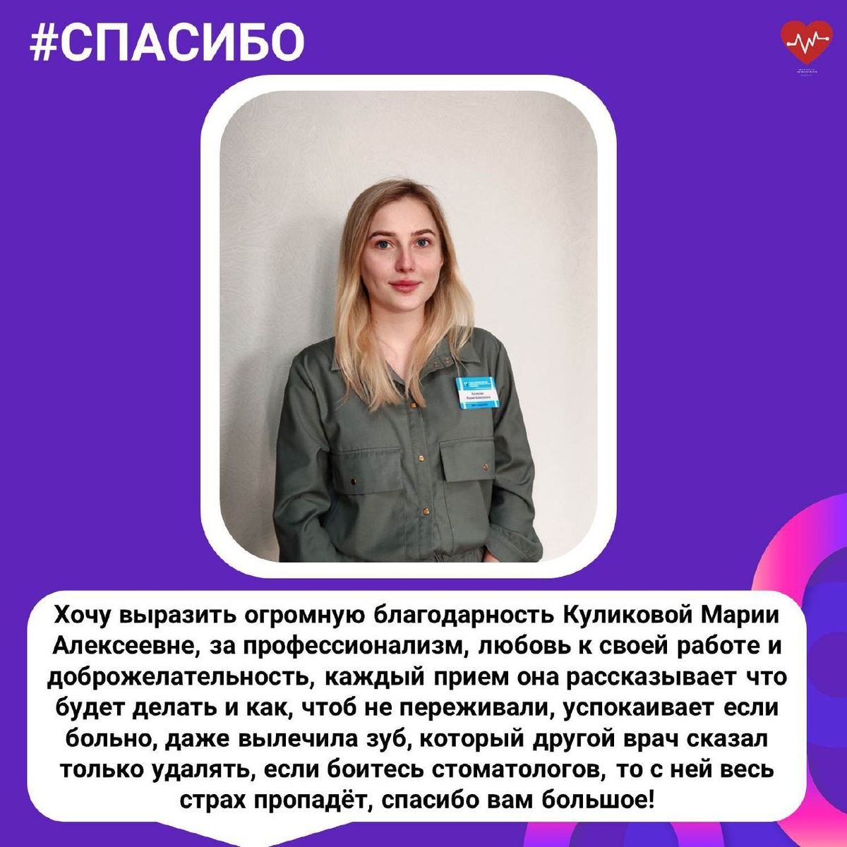 На этой неделе размещаем благодарность врачу стоматологу областной стоматологической поликлиники Куликовой Марии Алексеевне. Оставить благодарность медикам можно сканируя QR-код с помощью камеры вашего смартфона. Коды находятся на кабинетах врачей в поликлиниках и стационарах.