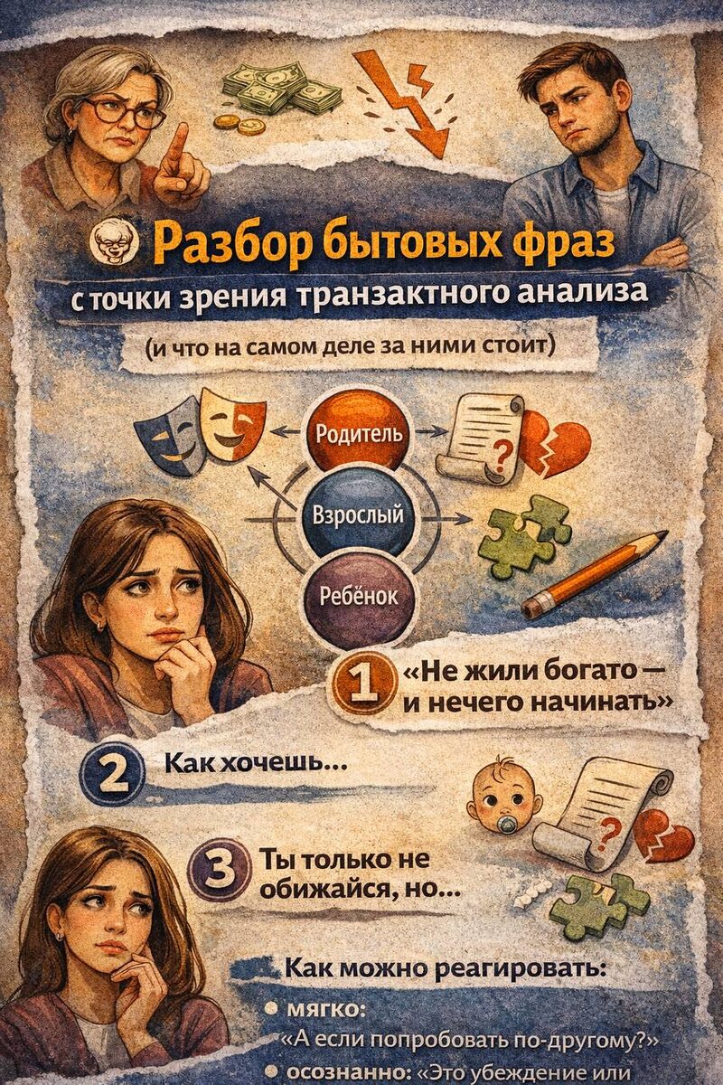 ». Сегодня 3-фразы, которые вы присылали под постами этой рубрики. 💬«Не жили богато — и нечего начинать» 💬«Как хочешь…» (очень важен контекст, когда это говорят) 💬«Ты только не обижайся, но…» Иногда мы говорим «просто фразы», а на самом деле — передаём сценарии, роли и скрытые послания. Разберём 👇 1️⃣ «Не жили богато — и нечего начинать» 🔍 Что за этим стоит? Это фраза из Родительского эго-состояния, чаще всего — 🧓 Критикующий или Структурирующий Родитель. 🧩 Скрытое послание: «Лучше не высовываться» «Деньги / успех / комфорт — не про нас» «Желать большего — опасно» 📜 О чём говорит сценарий: • запрет на рост • страх изменений • лояльность семейным установкам • убеждение: «хорошо — это подозрительно» 👤 Если ты говоришь это сам(а): Скорее всего, внутри: • страх разочарования • привычка снижать ожидания • защита от боли через отказ от желаний 💬 Как можно реагировать: • мягко: «А если попробовать по-другому?» • осознанно: «Это убеждение или реальный факт?» • поддерживающе се