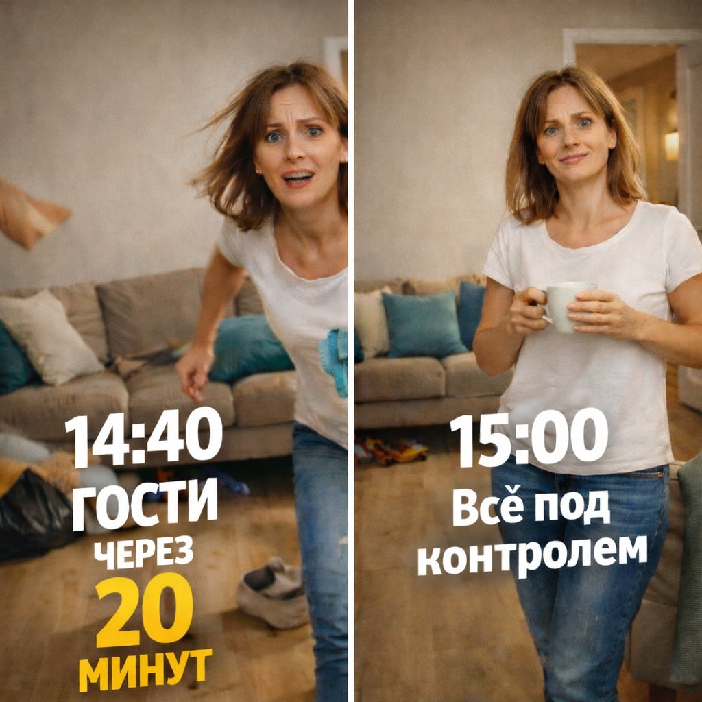 ⏰ 14:40 Звонок: “Мы уже выходим.” Мозг: “Отлично. Я — тоже. Из зоны комфорта.” ⏰ 14:42 Мозг: «Успеем.» Опыт: «Ври дальше.» ⏰ 14:47 Уборка за 20 минут — это не про чистоту, это про договорённость с совестью... ⏰ 14:52 Если вещь не нашла место — значит, она нашла судьбу. Под кроватью, в шкафу, в пакете... ⏰ 14:56 Закрытая дверь — символ порядка и внутреннего спокойствия. ⏰ 15:00 Гости: «Как у вас так чисто!» Я (не моргнув): «Мы просто любим порядок» 😌 👉 А сколько минут вам нужно, чтобы «любить порядок»?😌