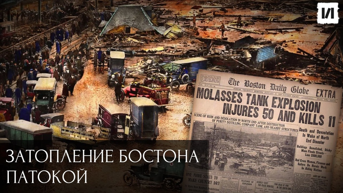 В районе Норт-Энд взорвался гигантский резервуар с мелассой (черной патокой) и на город обрушилось цунами из сладкого сиропа. Бак компании Purity Distilling был высотой с пятиэтажный дом и диаметром 27 метров. В нем хранилось почти 9 миллионов литров патоки, которую планировали перегнать в спирт. Резервуар трещал по швам и протекал так сильно, что местные жители собирали бесплатный сироп банками прямо со стенок. Владельцы просто покрасили бак в коричневый цвет, чтобы подтеки были не видны. В тот теплый день металл не выдержал давления. Резервуар разорвало. Образовалась волна высотой 8 метров, которая неслась по улицам со скоростью 60 км/ч. Из-за высокой плотности (на 40% тяжелее воды) и вязкости, патока действовала, как твердое тело. Волна сносила кирпичные здания, сдвигала дома с фундаментов и смяла пожарную часть. Эстакаду надземной железной дороги изогнуло ударом, и проходящий поезд чудом не рухнул вниз. Погиб 21 человек, 150 получили ранения. Спасателям пришлось смывать сироп с