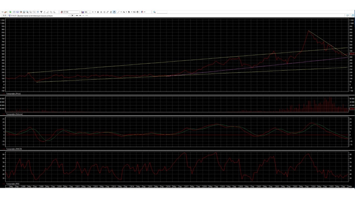 Недельный график показывает, что акцию Газпромнефть видим в слабо растущем тренде 275-610. Внутри тренда акция вышла из бокового сужающегося коридора и стала формировать боковой коридор внутри тренда. Боковой коридор до конца не сформировался. Быки под воздействием положительных новостей начнут движение к линии сопротивления тренда. Индикатор RSI снизу достиг уровня 60% и готовится пройти его или сделать разворот вниз. Индикатор MACD располагается под нулевым уровнем и двигается снизу к нему, объем торгов показывает небольшую активность инвесторов. Данная активность инвесторов в акции недостаточна, чтобы начать бурное движение вверх. Для этого компании нужно проинформировать инвесторов о своей дивидендной политике на 2026 год.