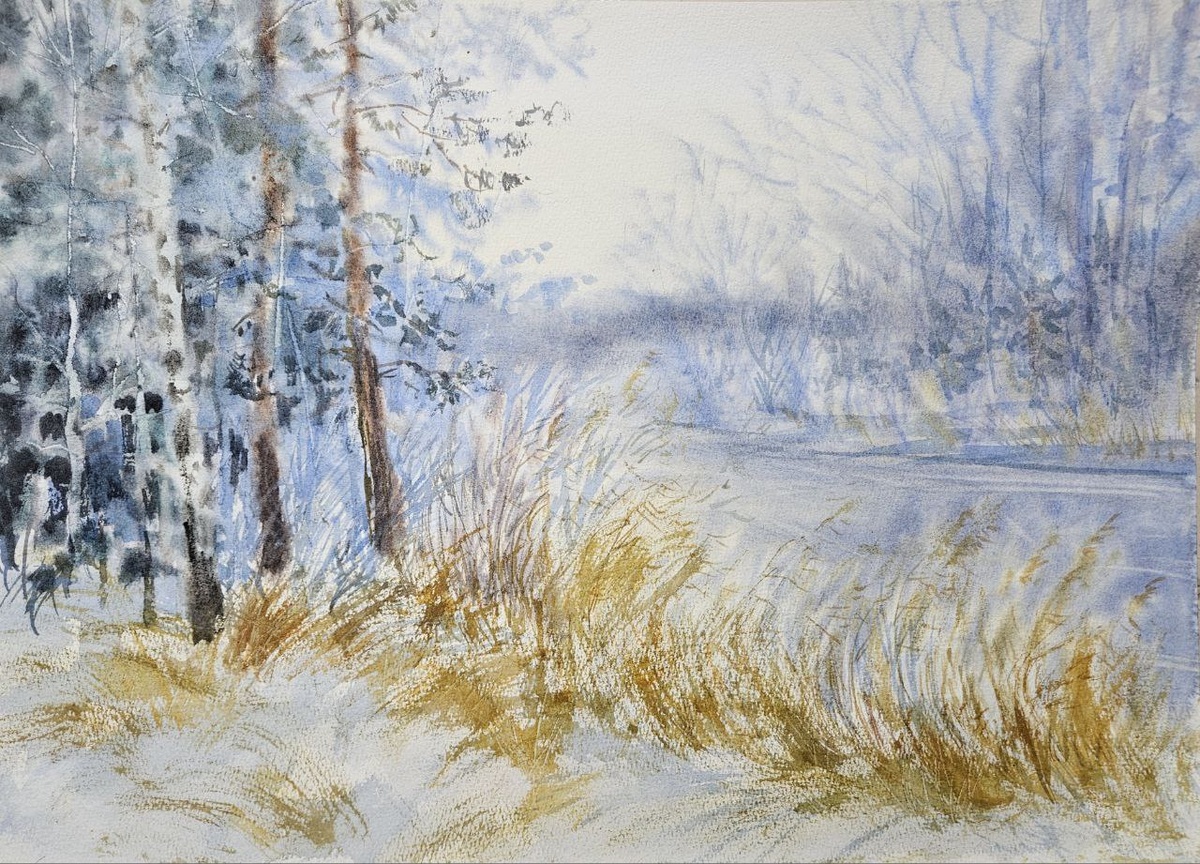 💗 Написала картину (бумага 100% хлопок/акварель 38×54 см) про это самое зимнее чудо ☃️ Всё такое тихое-тихое, холодное-холодное, а небо чистое-чистое и светится как хрусталь 🌲 И знаете, почему-то от такой зимы становится тепло внутри. Как будто смотришь не просто на снег, а на волшебную сказку из детства 😇 А пока… кутаемся потеплее и наслаждаемся этим особенным временем года 🎅 #пейзаж #зима #акварель