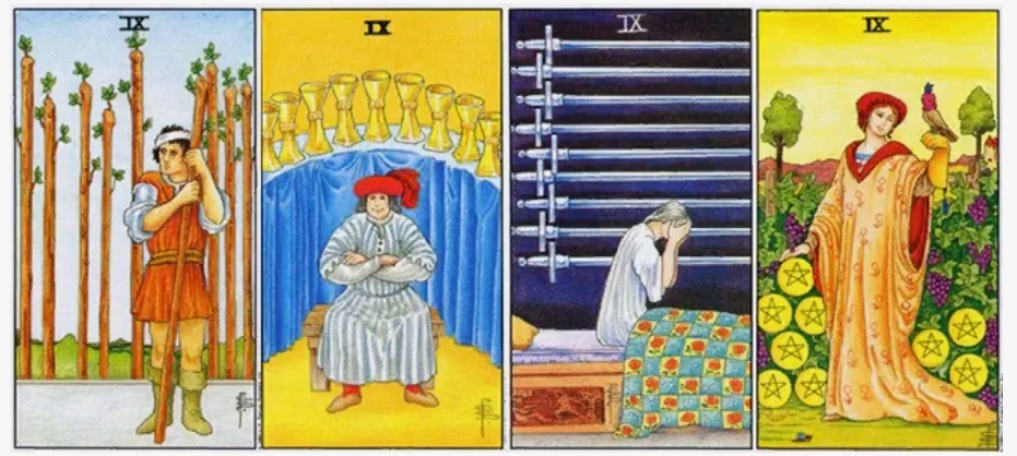 И все же, в отличие от других девяток, Девятка Жезлов отражает скорее характер Рыб, нежели Стрельца. Влияние Нептуна тут сильнее, а Юпитера слабее. символизирует ожидание трудностей и перемен, ожидание бурных периодов жизни и предчувствие их, предвидение вражды.