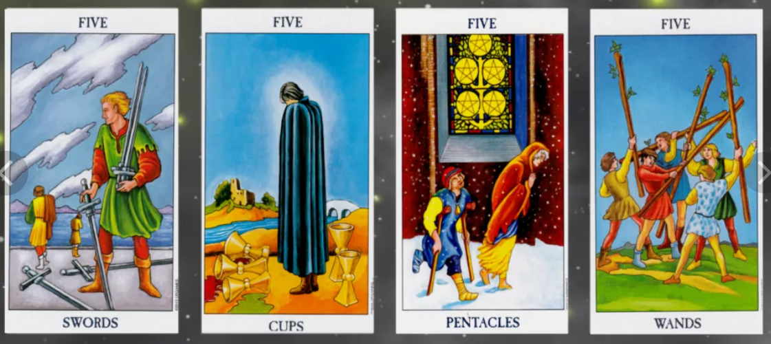 Вообще, если Четверки – это уверенность и упорядоченность в жизни, то Пятерки – внешнее воздействие, разбивающее иллюзию совершенства и ввергающее в подавленное состояние духа.