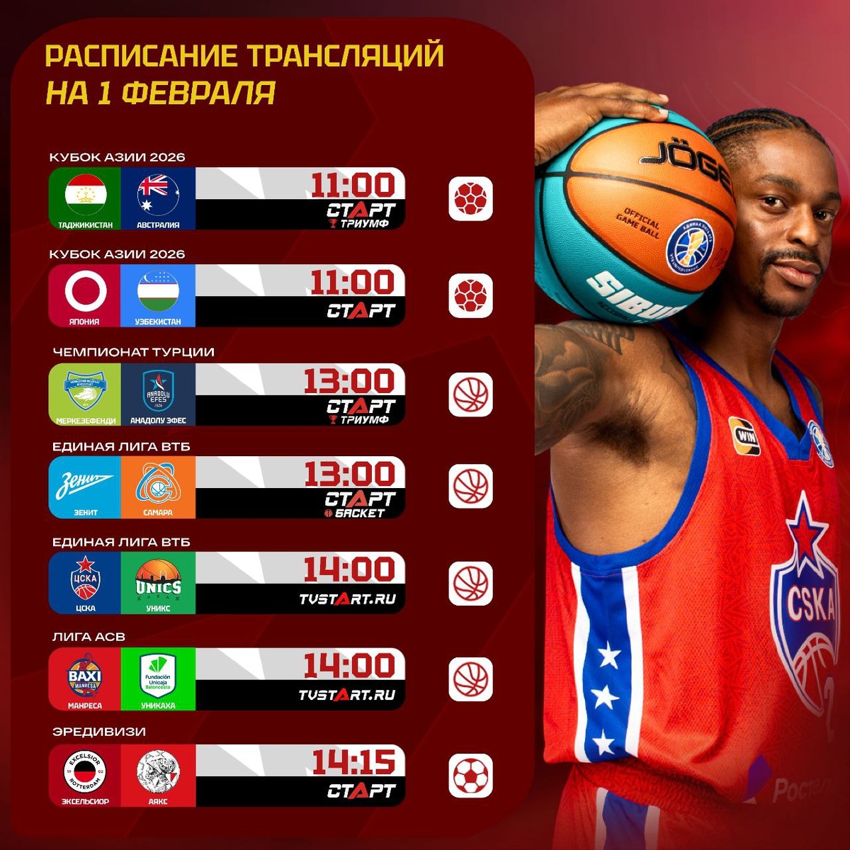 ! Сегодня покажем баскетбол, волейбол, гонки, футзальный Кубок Азии и, конечно, футбол. ПСВ против «Фейеноорда» – нестареющая классика Эредивизи. «Аякс», «Спортинг» и первый матч «Бенфики» Жозе Моуринью после легендарной победы над «Реалом» тоже на месте. Проведите воскресенье на платформе TVSTART.RU 🖥 Подписывайся на ТВ СТАРТ в MAX📲