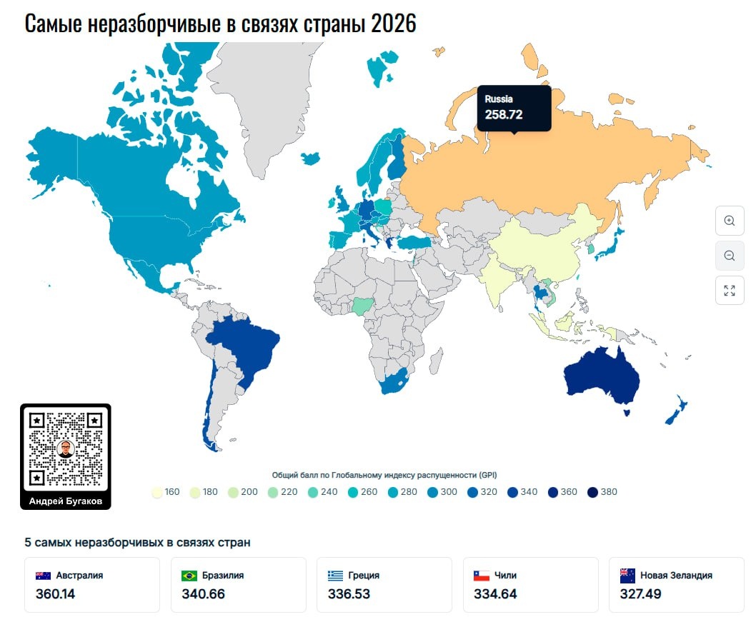 Рейтинг составило издание World Population Review. В списке 45 стран. За основу брали такие критерии, как средний возраст первого полового контакта, число сексуальных партнёров и легальность проституции. ❗️Согласно данным статьи, в России средний возраст вступления в половую жизнь – 18.7 лет, а среднее количество партнеров – 9. На первом месте Австралия, где первый сексуальный опыт молодые люди получают в 17.9 лет, а среднее количество партнёров – 13.3. Радует, что мы не в лидерах, но на самом деле разрыв с первым местом не такой уж и большой. Для примера в Китае девственности лишаются в 22.1 года, а половых партнеров за всю жизнь – 3.1, а в Индии первый половой опыт в 22.9, и всего три партнера в жизни. Вот к таким показателям нужно стремиться. Вот что значит страны воспитывают свою молодежь в соответствии с традиционными ценностями. Внизу рейтинга страны, в которых западная культура не имеет такого широкого проникновения как у нас. А у нас до сих пор людей воспитывает Голливуд. Д