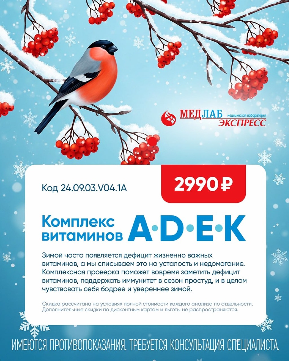 Холод, дефицит солнечного света и стрессовые нагрузки повышают риск нехватки жирорастворимых витаминов — A, D, E и K. Если вы ощущаете слабость, быструю утомляемость, заметили проблемы с кожей или волосами, либо принимаете витаминные комплексы без контроля врача — рекомендуем сдать полный анализ на витамины A, D, E и K. 🎁В заборных пунктах «МедЛабЭкспресс» действует акция: комплексное исследование 4 витаминов по сниженной цене. Такая оценка даёт врачу полную картину состояния и помогает назначить корректную, безопасную и эффективную терапию, учитывающую взаимодействие витаминов. Сдать анализ можно в любом удобном пункте! Будьте здоровы! #медлабэкспресс