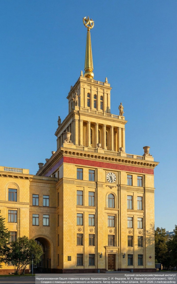 И. Федорова и М. А. Иванова 1951 г. Торжественная, запоминающаяся 57-метровая многоярусная башенная часть с граненым шпилем асимметричного здания института должна была выступать в роли главного въездного акцента для тех, кто приезжает в Курск с севера по трассе Москва — Симферополь. Архитектор Сергей Федоров вспоминал, что вдохновлялся архитектурным образом Казанского вокзала в Москве академика А. В. Щусева. Поскольку здание имело протяженный фасад, то были использованы крупные и ясные пропорциональные соотношения архитектурных масс и деталей, усиливавшие общее художественное впечатление. Возведение института началось в апреле 1954 г. После выхода в ноябре 1955 г. постановления «Об устранении излишеств в проектировании и строительстве» изменения в проект начали вноситься без остановки строительства. Башня лишилась двух ярусов и декоративных элементов. Здание СХИ было сдано в 1963 г. Один из авторов проекта архитектор Сергей Федоров (1915–2005) верил, что когда-нибудь над ансамблем у
