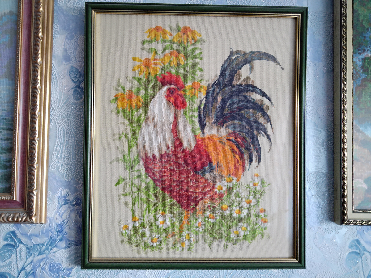 Как и обещала, продолжаю рассказывать про вышивки. Вот этот петушок попал на дачу. И я его впервые начала там. Помню, было сложно его вышивать. Может быть, потому, что клеточки мелкие, а может, по какой-то другой причине, но я вышивала его всё лето, поскольку вышивала только в непогоду, а в хорошую погоду была в огороде. Но я его все-таки сделала. А дальше — Санкт-Петербург, фонтаны. Тут и