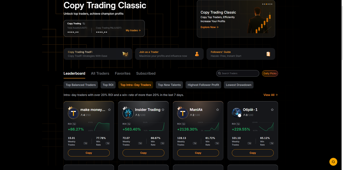 - Исследование лидеров: В разделе Copy Trading внимательно изучайте:Общую доходность (за 3, 6, 12 месяцев)
