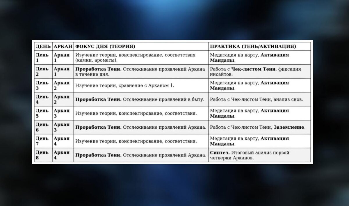 Если вы хотите не просто «пройти», а усвоить материал и получить реальные результаты, вам нужно работать не чаще, а структурированнее. 1. Золотое правило: не спешить! Не пытайтесь «проглотить» всё сразу. Если вы за один день пройдете 4 СА, ваше подсознание не успеет переварить даже один. Это приведет к ментальному туману и энергетической перегрузке. Оптимальный темп для усвоения: 1 Аркан = 2 дня. 2. Структура работы на неделю (7 дней) Ваша неделя должна быть разбита на блоки проработки. См . таблицу. 3. Техника дробления внимания. Чтобы успеть всё, нужно работать с материалом в разное время дня: • Утро (15 минут): Медитация на карту дня. Конспект теории. • День (30 минут): Работа с Чек-листом (анализ своего поведения, поиск проявлений Тени). • Вечер (30 минут): Ритуальная работа (ароматы, свечи, активация мандалы). Итог: Вам нужно выделить около 60-90 минут в день на глубокую, сфокусированную работу. 4. Почему такой подход эффективен? «Черный Гримуар» — это не информация, это энергетич