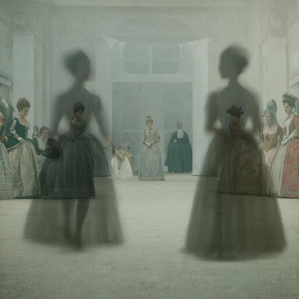 Именно здесь реальность начинает трескаться. Вместо туристов они видят людей в костюмах XVIII века: мужчин в зелёных ливреях и треуголках, которых принимают за садовников, женщин в платьях с фижмами. Воздух кажется им спёртым и необычайно тихим, лишённым привычных звуков современности. Кульминацией становится видение женщины, сидящей на ступенях павильона и делающей зарисовки в альбом. Она одета в светлое платье и напудренный парик. Позже, изучая портреты, Моберли и Журден придут к убеждению, что видели саму Марию-Антуанетту.