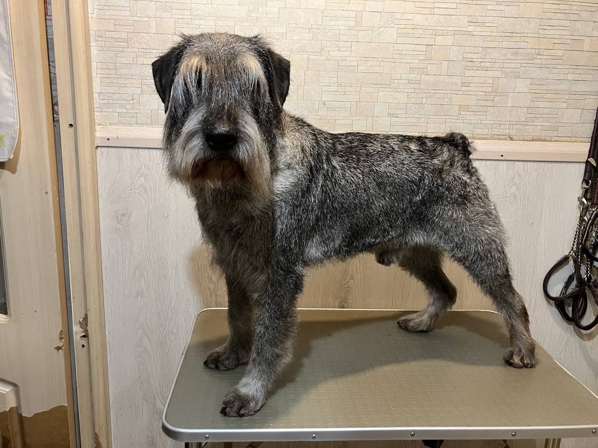 У нас плюс один миттельшнауцер. И он действительно хулиган. Даже Хулиган. По происхождению Металлик Хулиган, д.р. 19.2.2017. А так зовут Рон, 8 годков сейчас ему. Недавно нам попалось объявление, что в Павлово Ленинградской области бегает миттель с обрывком цепи, мы зарепостили это себе в группу, и нашлась соседка, которая этого миттеля знает. Она написала, что он живет на цепи в будке на даче, а хозяева зимой живут в квартире неподалеку. Раньше он гулял с пожилым хозяином, миттель его сильно таскал, а сейчас они давно самого хозяина не видели. Хороший человек Ольга попросила добыть контакты хозяев какие-нибудь, чтоб поговорить, вдруг им миттель не нужен. Контакты нам дали, созвонились с хозяйкой, она рассказала, что собакой занимался муж, но муж её слёг, а она ходит кормить собаку, которая осталась на даче, каждый день, благо дача от дома недалеко, но ей тяжело. Всю жизнь миттель жил на улице на цепи, в доме он жить не сможет. Официальную кличку она не помнит не то Хан, не то Султан,