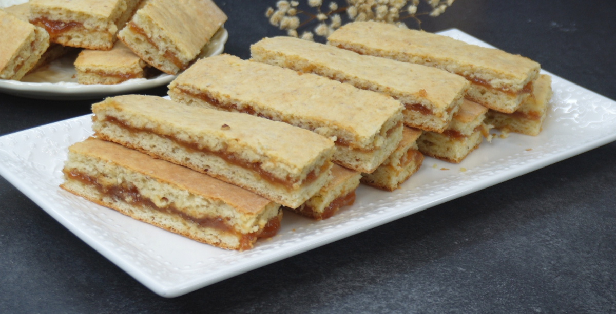 Теперь делим на 2 равные части. Раскатываем сначала один пласт, примерно 22 на 30 см. Кладем на противень. Смазываем вареньем или джемом (у