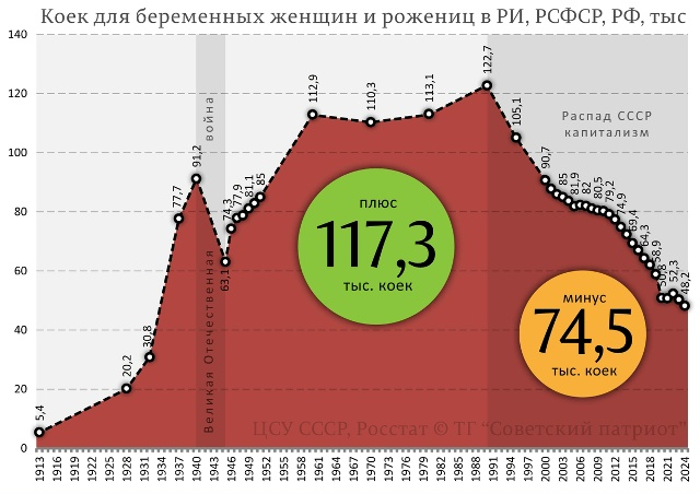 На фоне призывов больше рожать детей (за тарелку супа), федеральные СМИ опубликовали то, на что многие обращали внимание много, много, раньше, а именно на стремительно сокращающееся число роддомов и больничных коек для беременных и рожениц в России: с 122,7 тысяч в 1990 году до 48,2 в 2024 г. Но что более всего поразительно , так это попытка оправдать это тем, что в результате "оптимизации" у них, якобы, выросла эффективность использования одного койко-места. Да, как сказано было в одном фильме... Ну не может физически женщина родить раньше положенного. Мол, если в "неэффективном" Совке на 10 тысяч женщин приходилось 34 койки для беременных и рожениц, то теперь в 2,4 раза меньше — 14. Что очень хорошо для экономии бюджета, по их мнению. А то, что теперь будущим мамам ради такой "эффективности" приходится ехать для родов за десятки, а то и сотни километров в ближайший крупный город или региональный центр, а не свой райцентр, как было в СССР, т.н. эффективными менеджерами не учитываетс