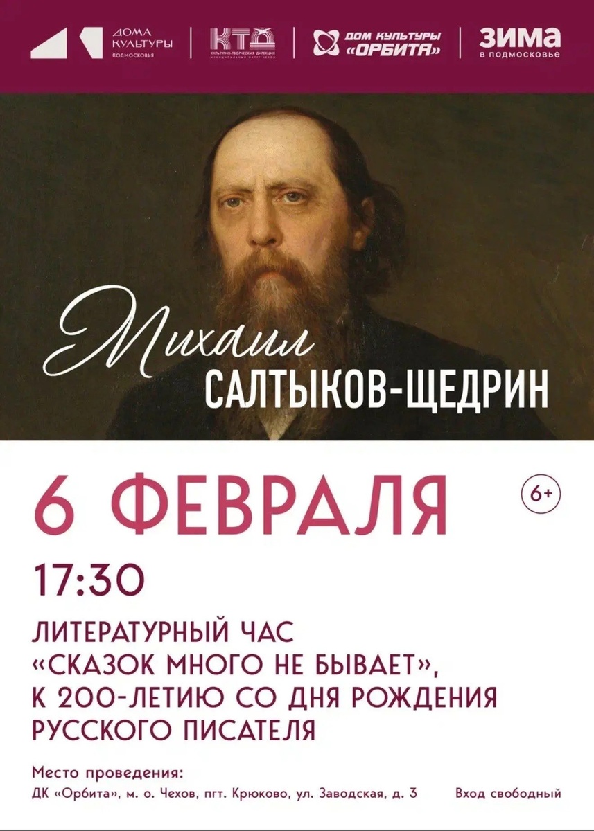 ✨ Литературный час, посвященный творчеству писателя М.Е. Салтыкова-Щедрина ‼️В честь 200-летия М.Е. Салтыкова-Щедрина состоится литературный час «Сказок много не бывает», где участники погрузятся в мир сатирической прозы и остроумных рассказов мастера слова. 📖Гости узнают о жизни и творчестве писателя, обсудят его знаменитые сказки, а также поучаствуют в викторине и творческих заданиях, связанных с творчеством Щедрина. 🚫 Возраст: 3+ 📆 06.02.2026 🕛 17:30 🏢 ДК «Орбита» 📍 г.о. Чехов, д. Крюково, ул. Заводская, д.3 🪙 Вход свободный❗️ ⭐Поддержать канал голосом ✅ Мероприятия Чехов https://dzen.ru/id/66cc4b48e9ef144699238a51 http://vk.com/chekhov_events http://dzen.ru/chekhov_events