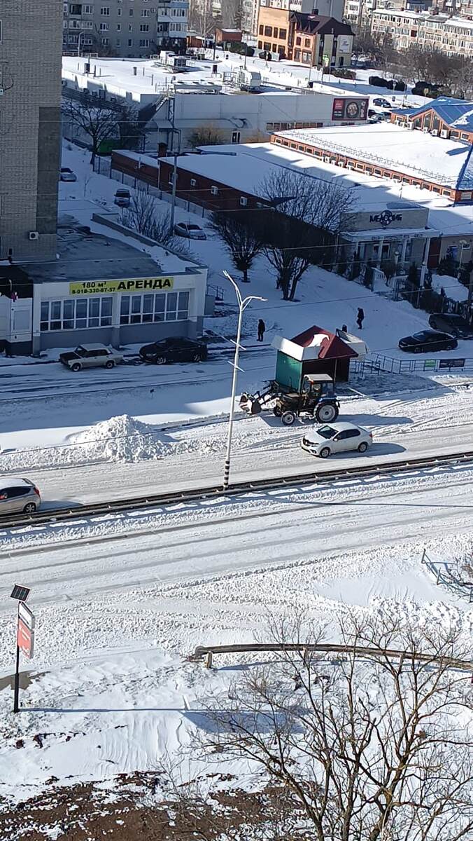 Третье февраля. Вчера был сильный снегопад. Хорошо, что за ночь городские дороги расчистили от снега. Утром в окно увидела, как трактор сгребал снег в кучу возле остановки.