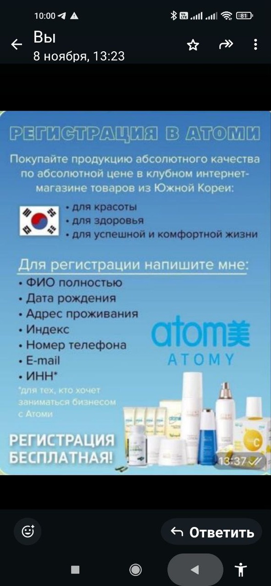 Вот данные для регистрации. Ни к чему не обязывает, можешь быть просто клиентом и покупать товары со скидкой, а ещё и участвовать в акциях и получать подарки.Присылай мне @svetikribka68
