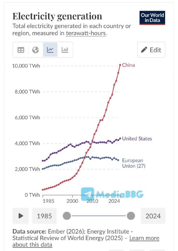 В настоящее время Китай производит на 40% больше электроэнергии, чем США и ЕС вместе взятые